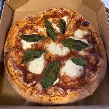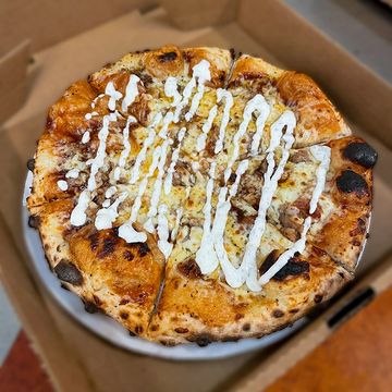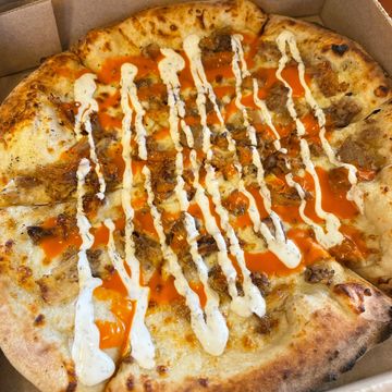 Sausage and basil over San Marzano sauce, topped with shredded mozzarella then finished with dollops of ricotta and a drizzle of hot honey.