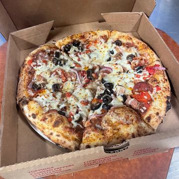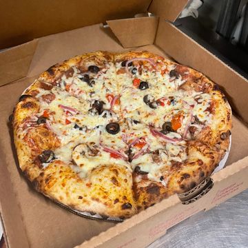 Sausage, pepperoni, fresh mushroom, olive, onion and fire roasted red pepper, with our cheese blend and San Marzano tomato sauce.
